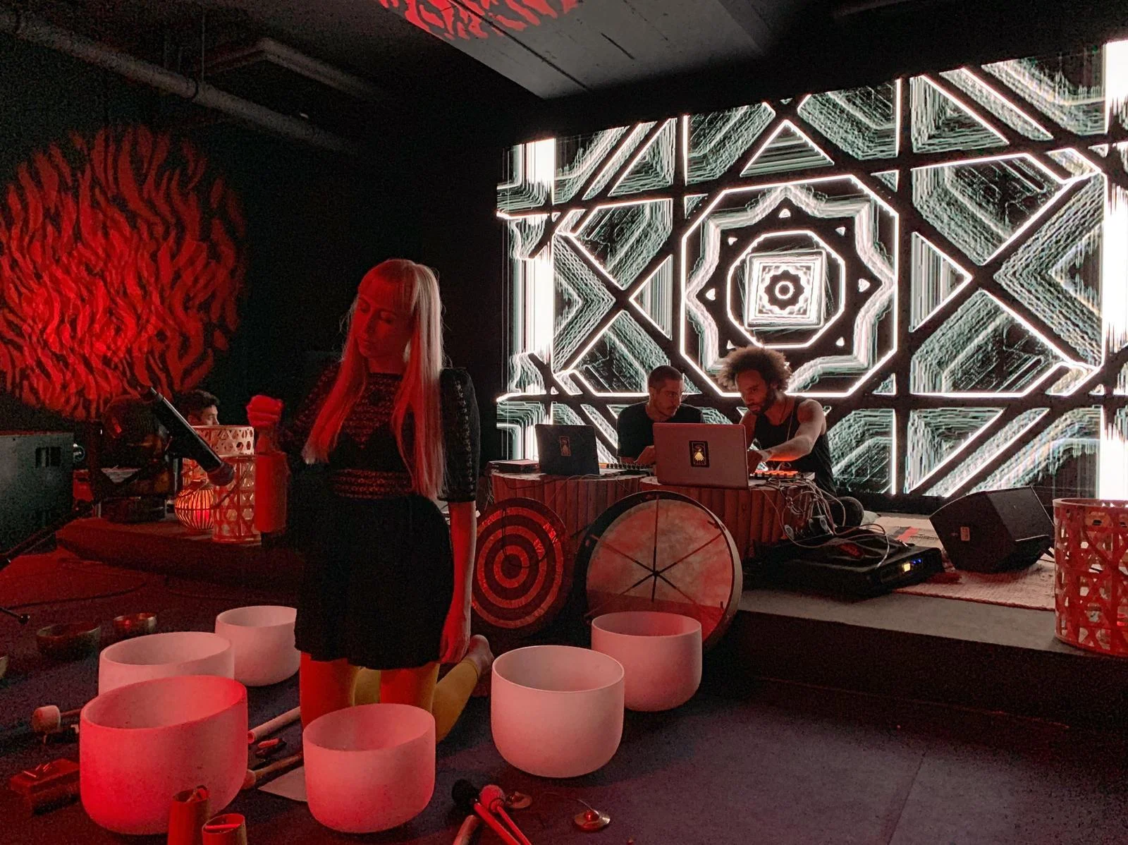 We create and perform our multi-dimensional music spatially with a mix of acoustic and digital instruments. We fuse ancient, mystical instruments such as the gong, quartz crystal singing bowls, chimes, shamanic drum, Tibetan singing bowls and tuning forks, with digital sequencers, controllers and other instruments like the Artiphon to expand and innovate the way we express this new music. We perform in multiple dimensions instead of just two (stereo) to reach higher dimensions. Our setup is adaptive and can range from a minimum of 8 speakers to arrays of 32, 64 or more both in setups surrounding the crowd as well as in a full sphere.